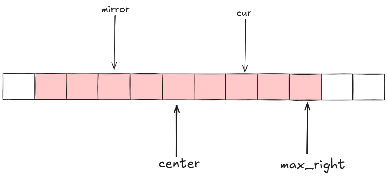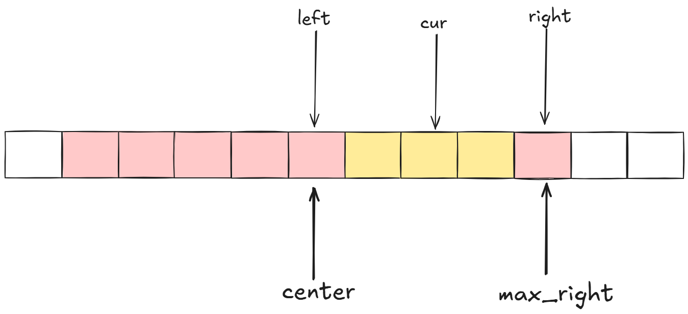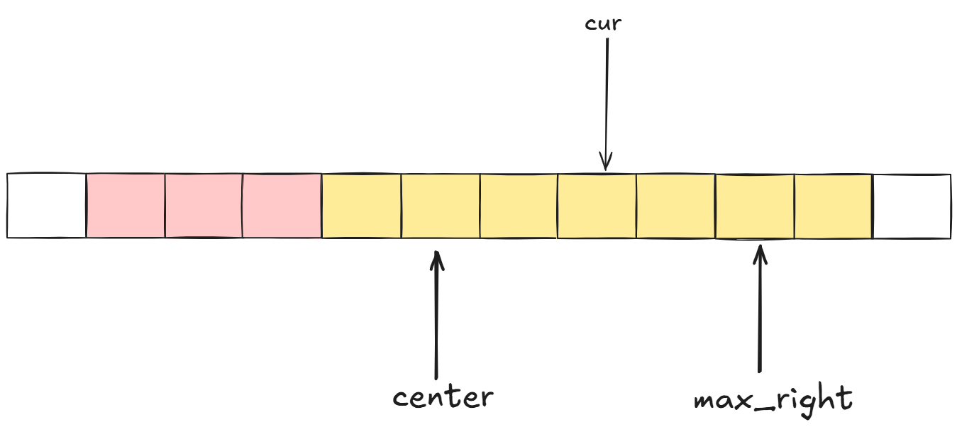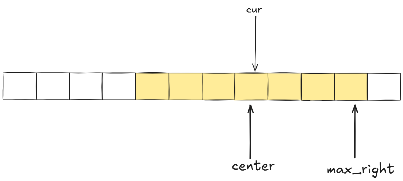 由此,我们的算法需要记录当前回文子串能覆盖的最右边界max_right,和对应的中心center。当我们遍历到cur的时候,计算出cur关于center的对称位置: