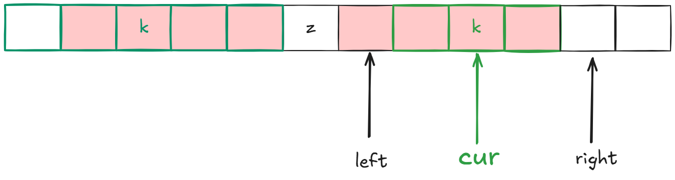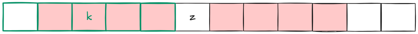 这三个字符一定是相等的,因此我们就确定了以z右边的k为中心的回文子串长度是多少,那么下次到了k,我们就能从不能确定的位置开始比较:
