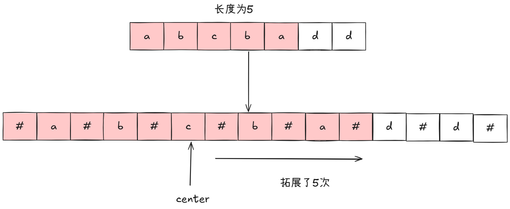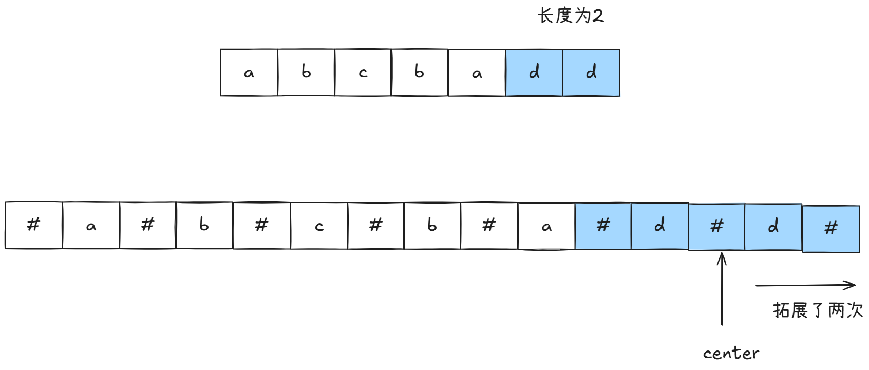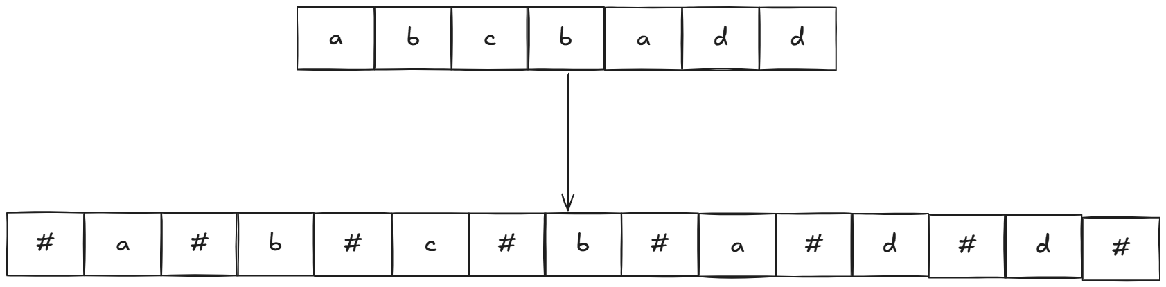 此外,为了不分类讨论奇数情况和偶数情况的回文串,我们在回文串中插入一个不在回文串范围内的字符,比如'#':