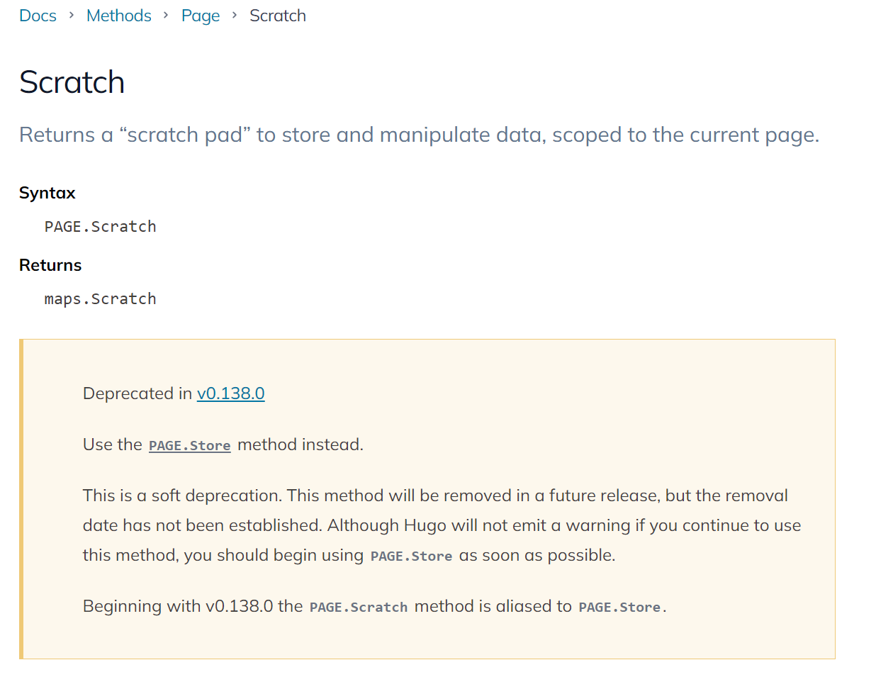 可以看到,$,Scratch(也就是 PAGE.Scratch) 在 Hugo v0.138.0 版本开始,已经被官方标记为 soft deprecation 软弃用了,并推荐使用 PAGE.Store
