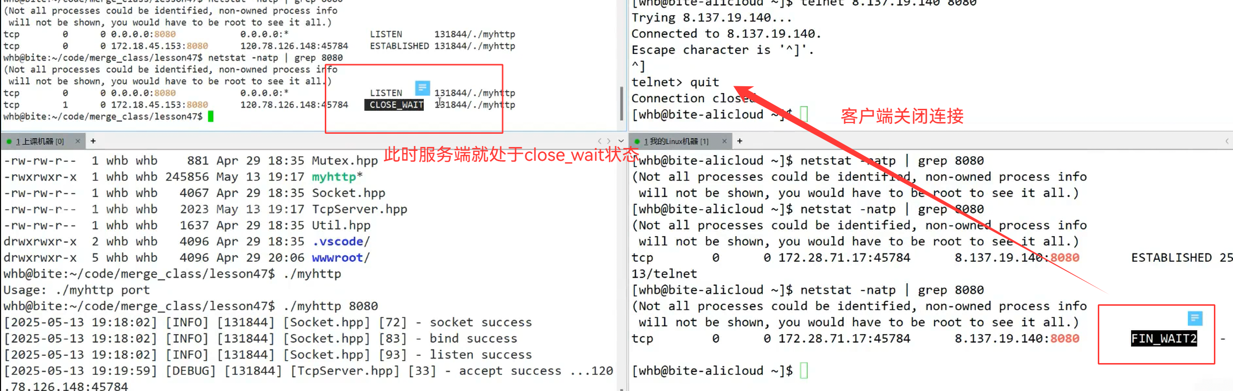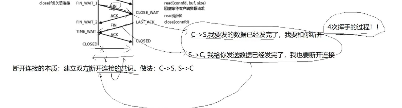此时也会有一个问题,这个断开连接的过程我们知道了,可是一旦客户端给服务端发送了FIN报文,然后收到服务端的确认报文之后就立即close掉了自己的文件描述符,此时如果服务端还有剩下的报文数据没有发送过去就会出现无法发完的情况,为了面对这种问题,我们可以让此时的客户端先关闭写端,服务端先关闭读端,此时双方都变成了半双工