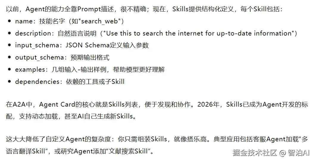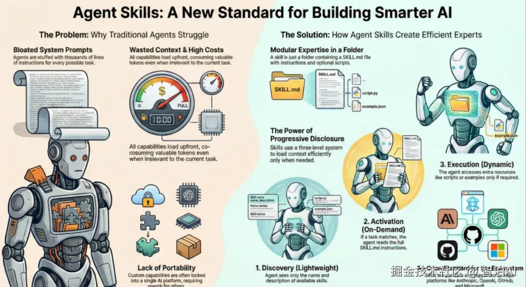 让通用AI Agent瞬间变成某个领域的"专家"。它不是单纯的工具(tool),而更像给Agent的"专业培训课程+操作手册+记忆卡片"。