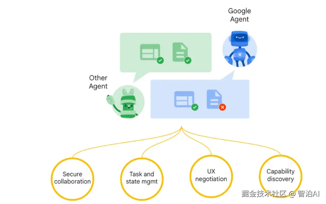下图为Google官方风格的A2A协作示意图,直观呈现多Agent通过协议互联的协作网络: