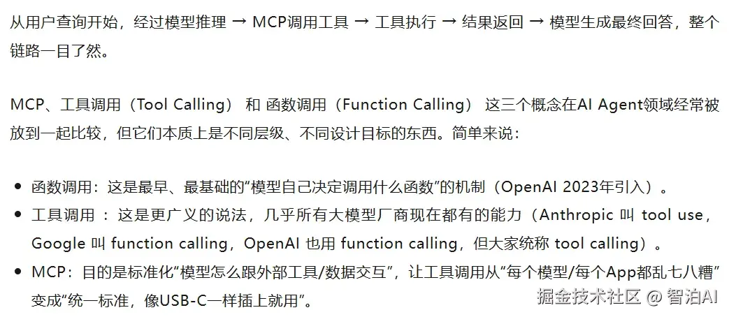 MCP(Model Context Protocol)是Anthropic 2024年底推出的标准化协议,现在几乎所有大模型都支持。它让模型安全、统一地调用外部工具/API/数据,而不用每个模型写一套格式。
