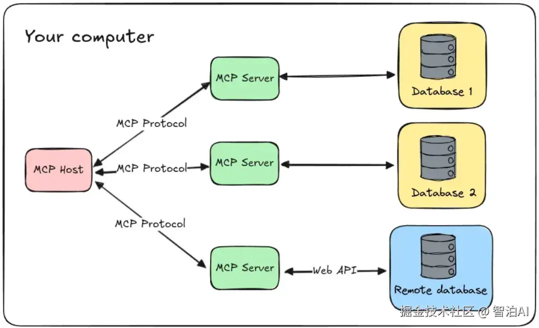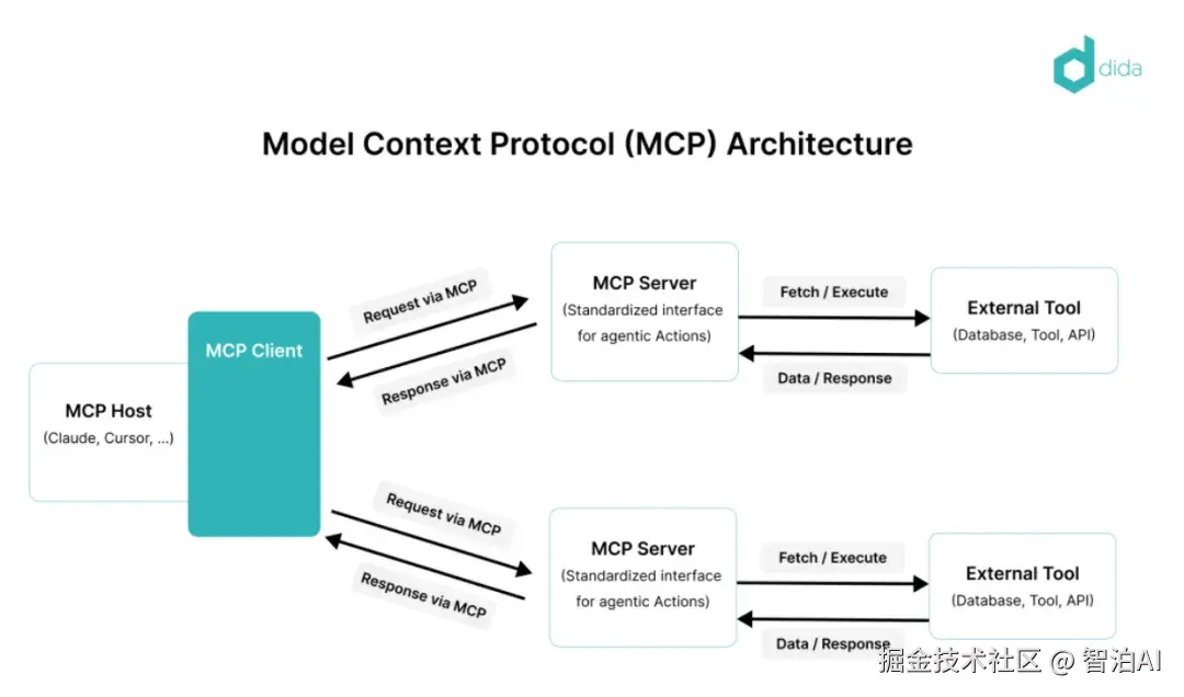 它常与A2A结合:Agent间协作时,用MCP调用底层工具。这张是MCP最经典的架构分解图: