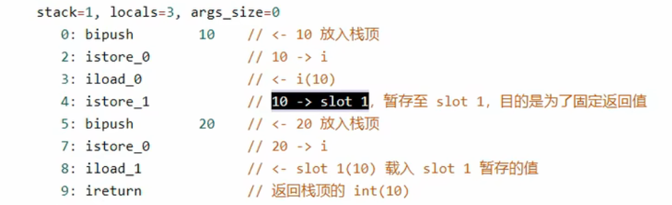 返回值还是10,因为在取得值的时候会额外istore一次,是为了在后面被加载读取