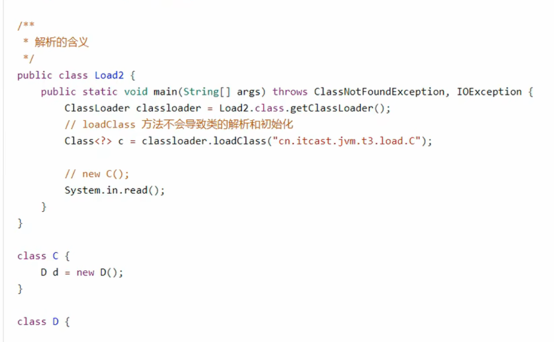 懒加载:类加载器加载C不会解析C,所以D也不会被解析和加载。但是如果new C,C会被完全解析和加载,所以D也会被解析和加载