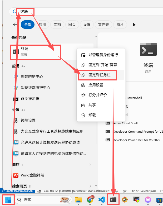 搜索"终端",右键选择 "固定到任务栏" ,后续再使用直接从任务栏单击就可以了。