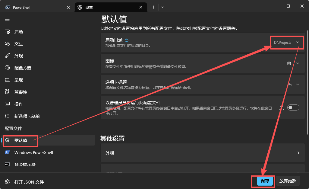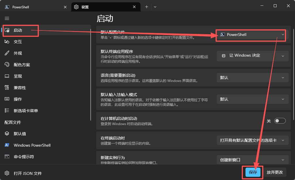 - 配置启动窗口为刚才安装的 PowerShell。