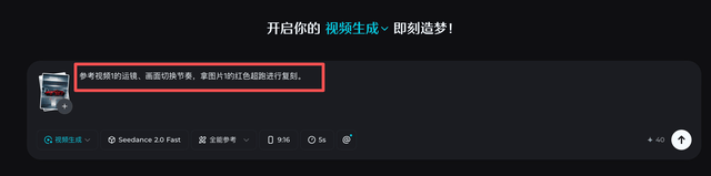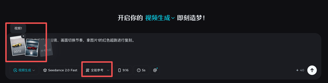 - 输入:参考视频1的运镜、画面切换节奏,拿图片1的红色超跑进行复刻。