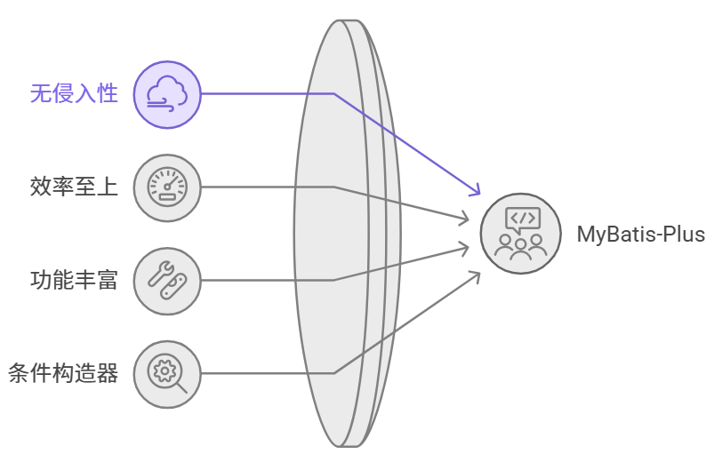 MP 具备多项显著特性。首先是无侵入性 ,引入该框架不会对现有工程产生负面影响,能够"润物无声"地融入项目。其次是效率至上 ,开发者只需进行简单配置,即可快速完成单表的 CRUD 操作,从而节省大量编写基础 SQL 的时间。此外,MP 功能丰富 ,内置了代码生成器、自动分页插件、逻辑删除、自动填充以及性能分析拦截器等一应俱全的实用功能。针对复杂的数据库操作,MP 提供了强大的条件构造器(Wrapper),支持通过 Lambda 表达式引用实体类属性,既避免了硬编码字段名的风险,又极大地提升了代码的可读性与维护性。