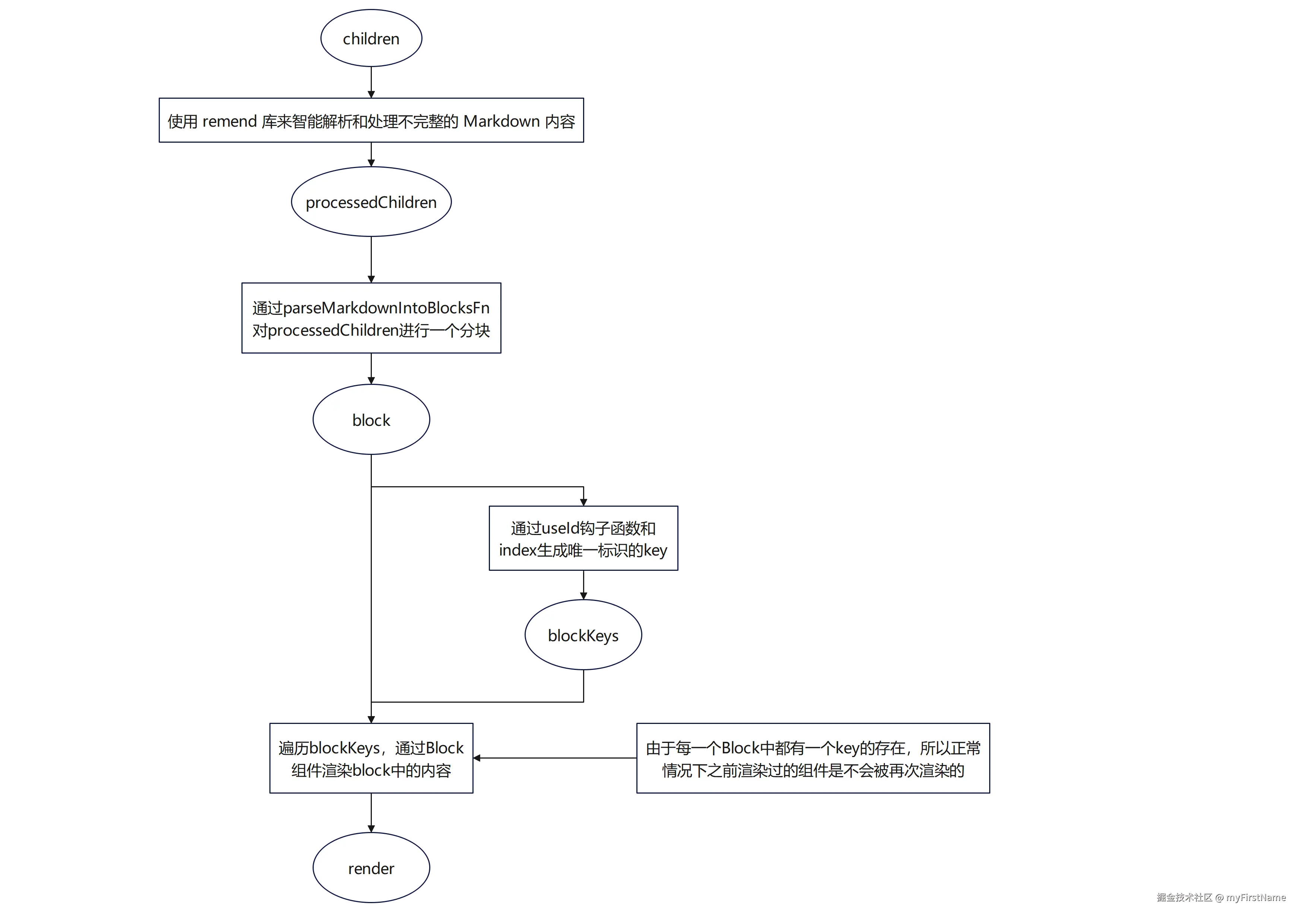 在这个数据流向中,只要children发生了变化,就会走一遍上面的流程。由于children是一个会频繁变化的变量,所以上面的流程也会频繁的走。但是Streamdown组件优化的点就是,由于唯一的 key 值的存在,在渲染过程中相同 key 对应的 Block 组件实例不会被销毁重建,而是直接复用已有实例,而且Block组件又有memo包裹住,所以在渲染的时候,会进行一个浅比较,props没有发生变化,就不会触发这些组件的重渲染。由于最新的Block的props中的content可能会新增内容,所以需要进行渲染的地方也是最新的Block组件。