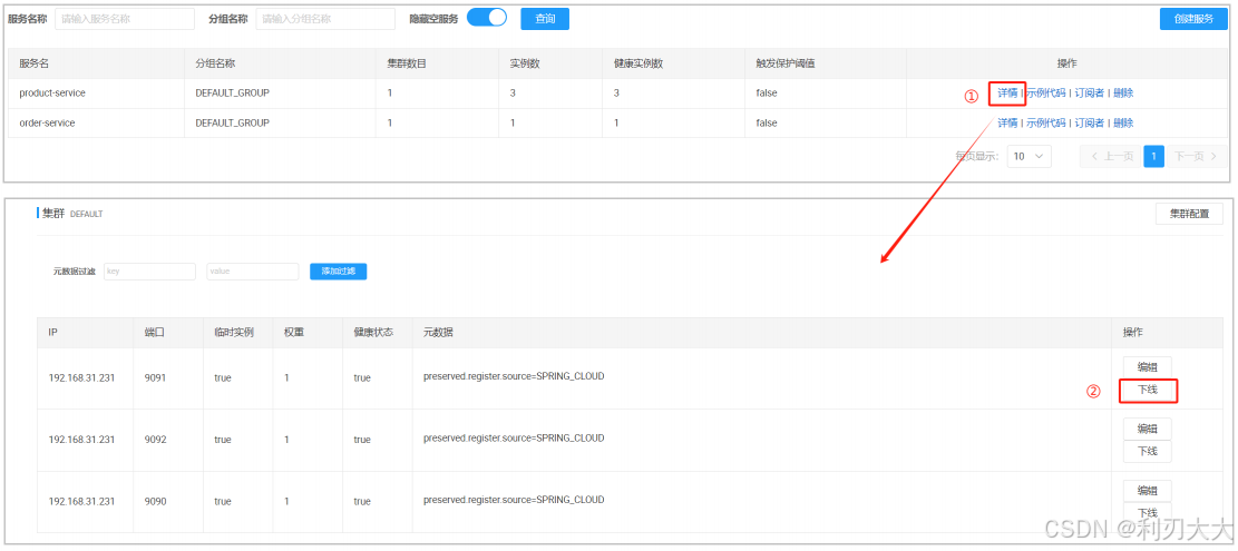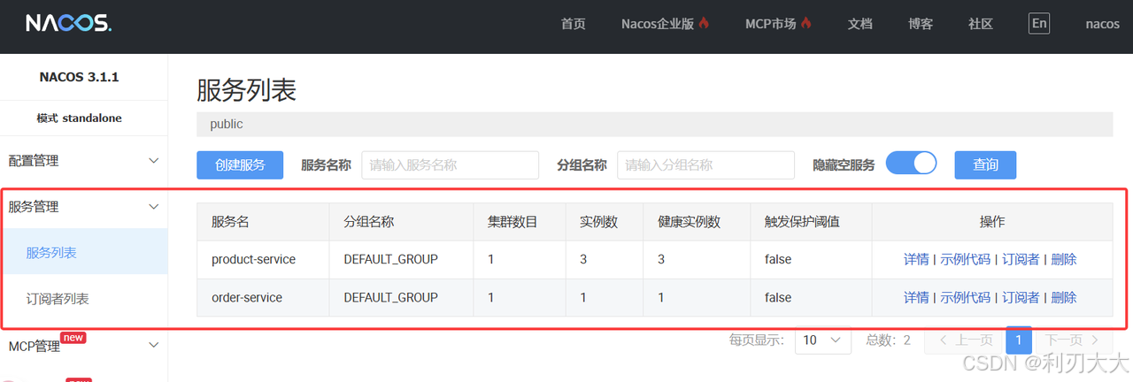 启动一个 order-service 服务,再启动三个 product-service 服务,观察 Nacos 的管理界面,发现 order-service 和 product-service 都注册在 Nacos 上了:
