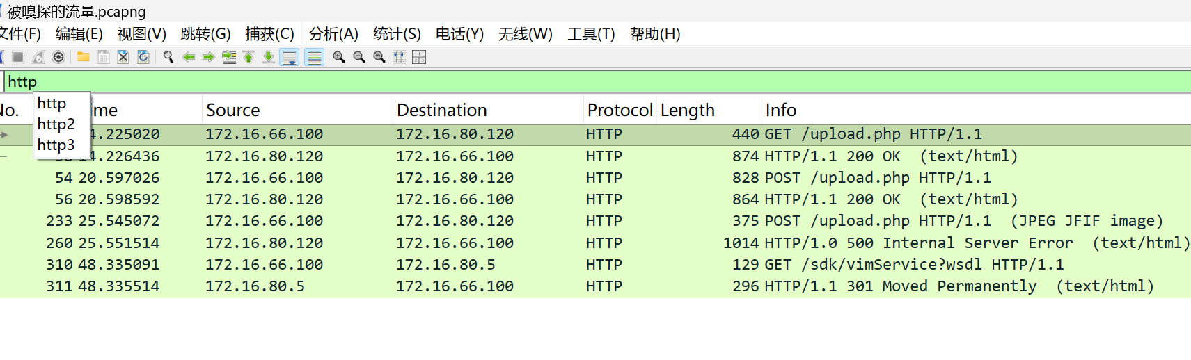 流量分析题目,我们使用工具wireshark打开题目所需的文件,然后我们直接搜索追踪http流发现