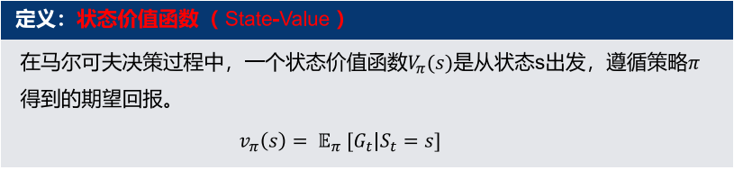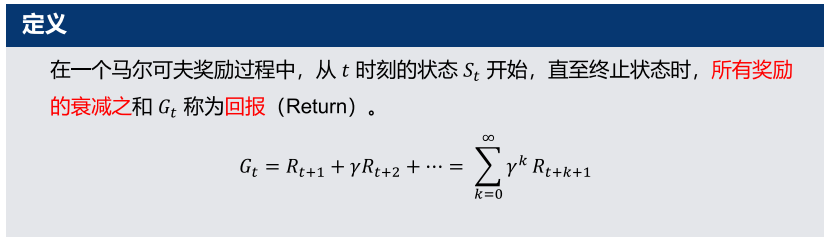 定义:从t时刻状态S_t出发,到终止状态的衰减累积奖励,记为