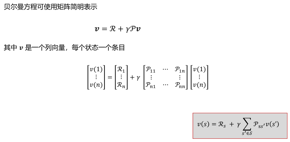 直接解析解:通过矩阵求逆求解,复杂度为O(|S|^3),仅适用于小型 MRPv=(I−γP)−1R