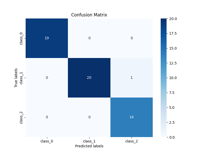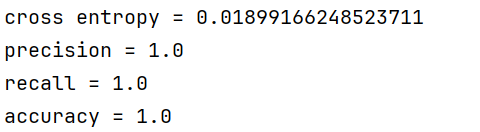 运行结果显示,模型在测试集上的表现非常出色,交叉熵损失非常低,精确率、召回率和准确率都达到了1.0,这意味着模型在测试集上的所有预测都是正确的,没有出现任何误分类的情况。这表明模型对于这个特定的数据集和问题具有很高的分类性能。然而,这种完美的表现可能也暗示了过拟合的风险,特别是在数据集较小或者模型过于复杂的情况下。