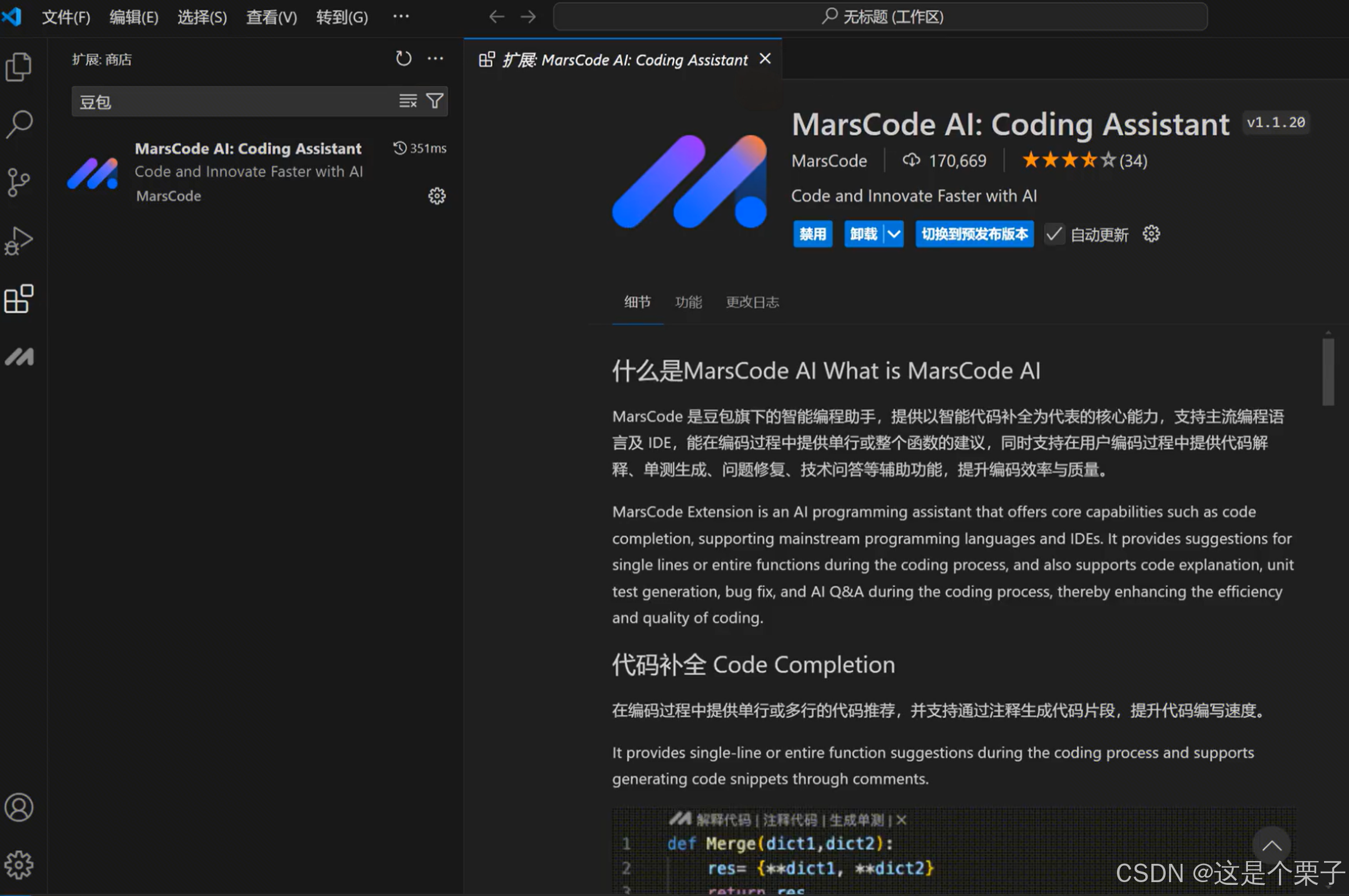 - 打开 VS Code 扩展商店,搜索 "MarsCode"。