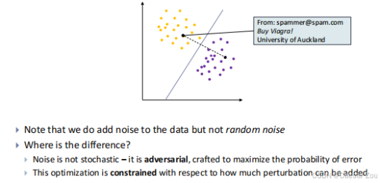 - 例如,在图中,对抗性噪声被添加到垃圾邮件中,迫使该邮件移动到接近正常邮件的区域,从而欺骗分类器,使它错误地将垃圾邮件识别为正常邮件。