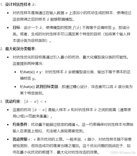 - 对抗性噪声是有目标的,它被精心设计来最大化模型的错误概率。攻击者通过优化算法生成这种噪声,使得模型的决策被误导,虽然人类读者仍然可以轻松理解被扰动的输入。