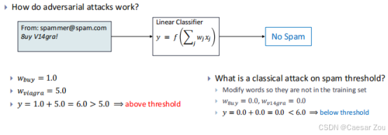 - 然而,通过加入对抗性噪声,这封垃圾邮件被迫移到接近正常邮件区域(接近分界线),导致分类器可能无法正确识别它为垃圾邮件。