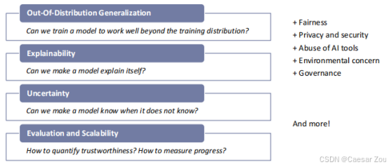 - 分布偏移 → 脆弱性:当训练数据和实际应用中的数据分布不同,模型可能变得脆弱。在新的区域中,什么是"真实"的?