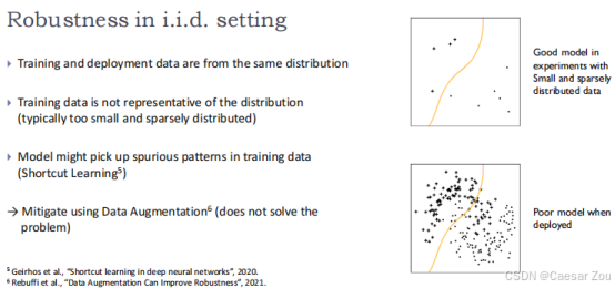i.i.d. 场景中的鲁棒性:这是机器学习中最常见的一种场景,假设数据独立同分布,但实际情况下,训练数据可能无法代表真实世界的复杂性,导致模型在部署时表现不佳。尤其是当训练数据稀少且分布不均时,模型可能学到错误的模式,无法适应实际环境。