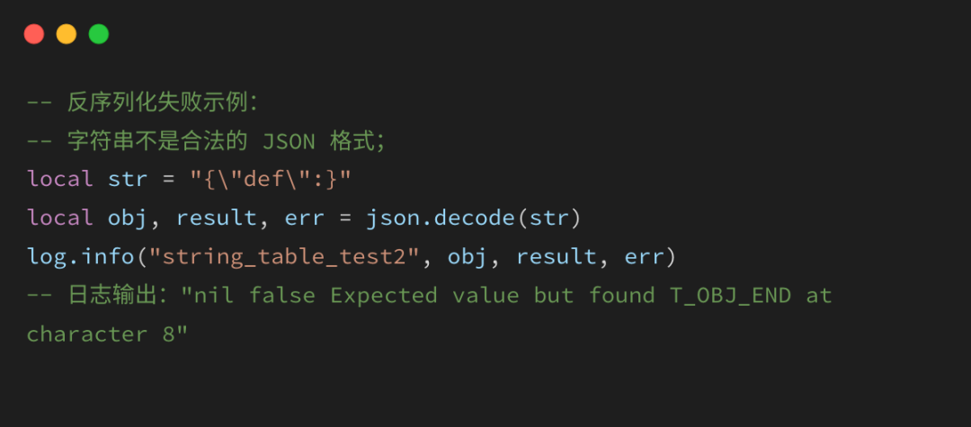 输入字符串必须是合法的JSON文本,否则会解析失败;成功时返回反序列化结果和状态码1,失败时返回nil、状态码false和错误信息。