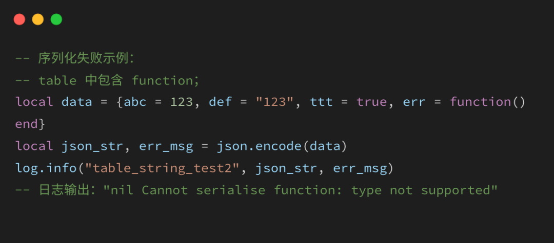 功能是将Lua对象序列化为符合JSON格式的字符串。