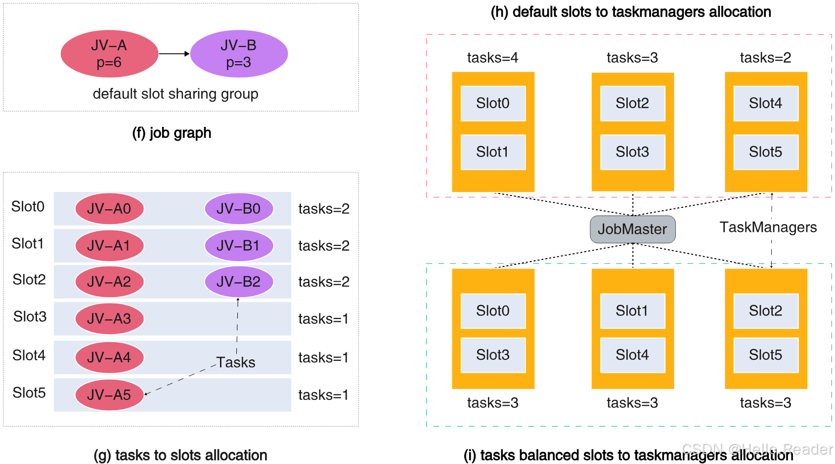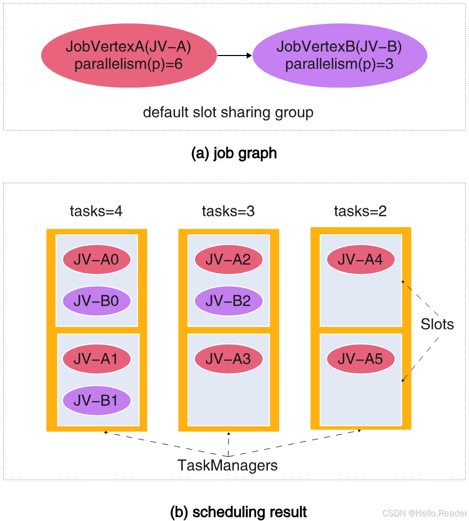 - 例子:JV-A 并行度 6,JV-B 并行度 3,同一个 slot sharing group