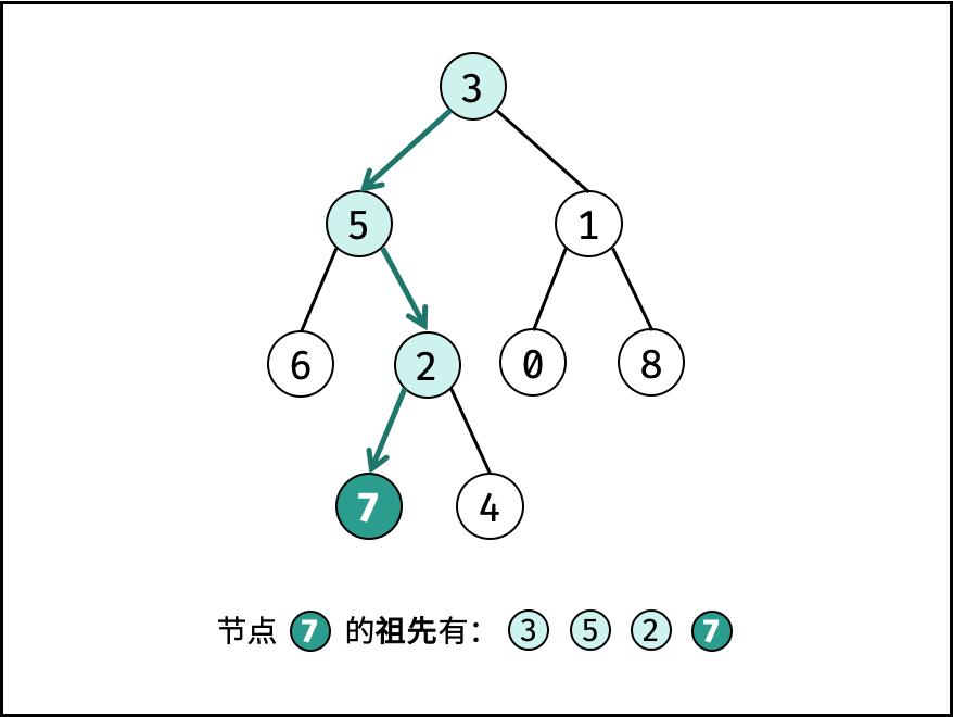 向下递归,向上回溯,首个同时包含 p 和 q 的节点为答案