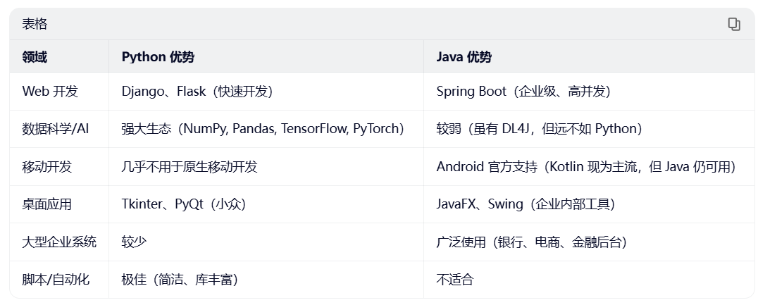 Python是简洁的、可读性强的;强调"可读即文档";JAVA是比较冗长,结构严格的。