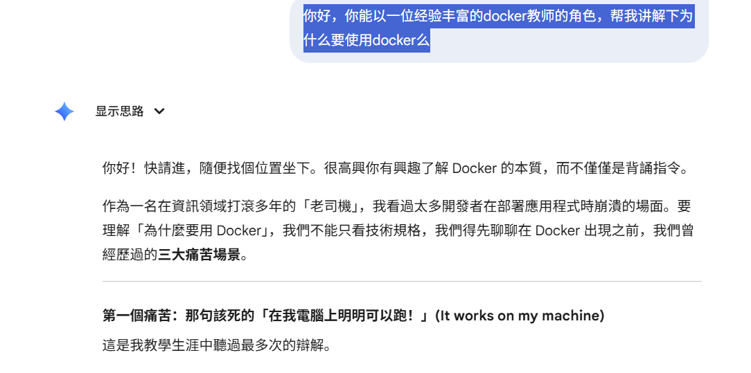 提示词: 你好,你能以一位经验丰富的docker教师的角色,帮我讲解下为什么要使用docker么。果然,此时AI立马以指定的角色进行输出。觉得例子浅显易懂。第一个例子就狠狠的共情了!!!