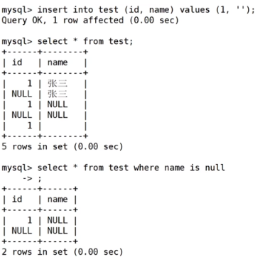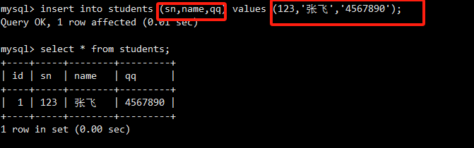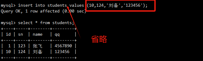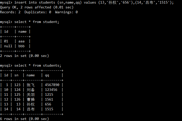 这条语句省略了列名列表,直接提供了id和name的值。MySQL会按表定义的顺序id, sn, name, qq来匹配值。由于id是自增主键,可以插入NULL或不提供该列,让系统自动生成。这里插入NULL后,id自动生成为1(因为这是第一条记录)。