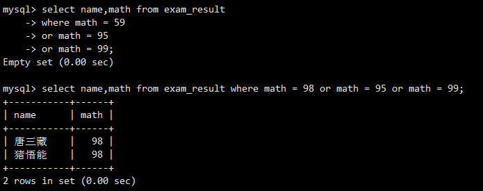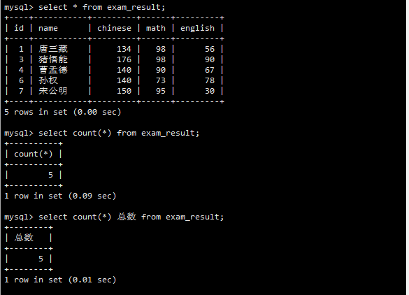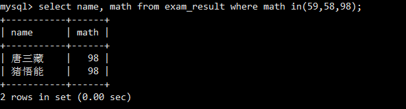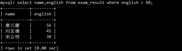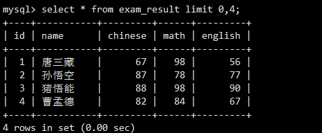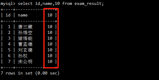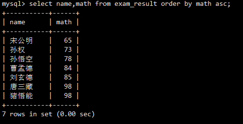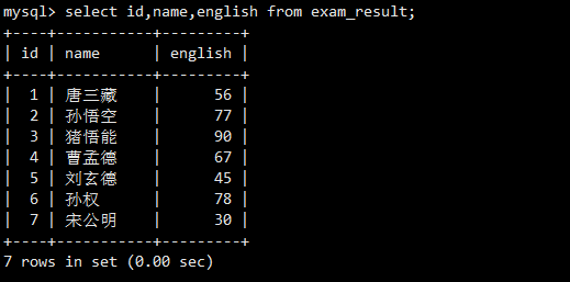 只查询了id, name, math三列,并且列的顺序与表定义不同,证明了查询列的顺序是灵活的。