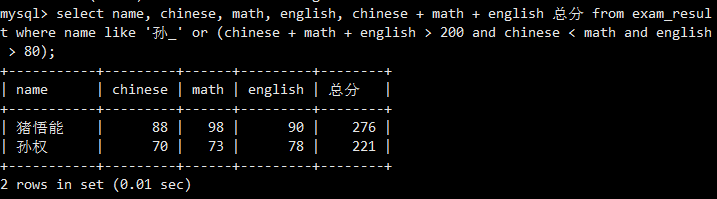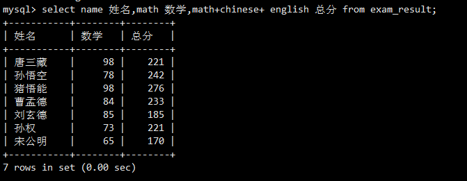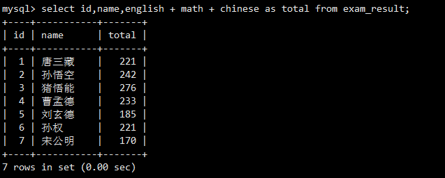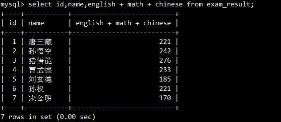查询name和三科总分,SELECT子句中可以包含涉及多个字段的复杂表达式。