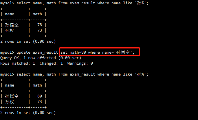 将name为'孙悟空'的同学的数学成绩更新为80。