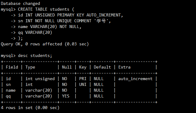 这个CREATE TABLE语句定义了一个students表,包含id(自增主键)、sn(学号,唯一键)、name(姓名)和qq(QQ号)四个字段。这是一个结构清晰、约束完备的示例表。