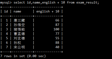 查询name和chinese + 10,MySQL为每位同学的语文成绩加上10分后返回。