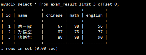 LIMIT 3, 3从第4条记录开始(偏移量3),返回3条记录。