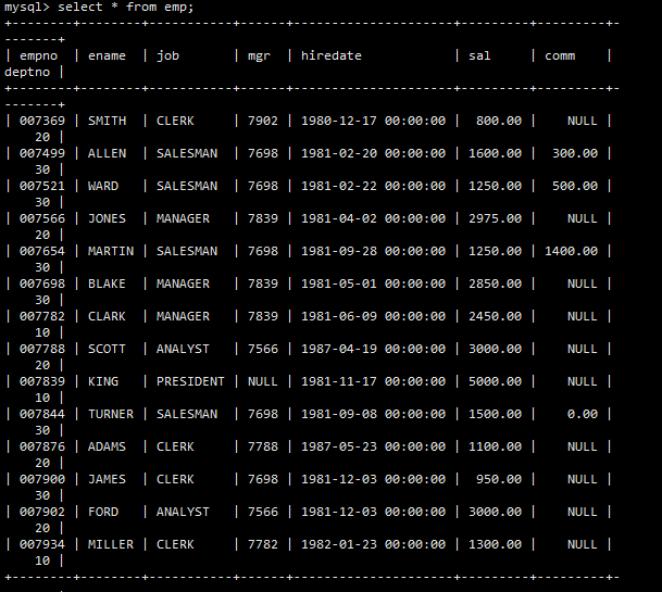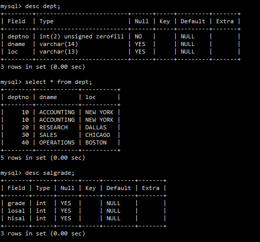 准备了dept(部门)、emp(员工)、salgrade(薪资等级)三张表并导入了数据。