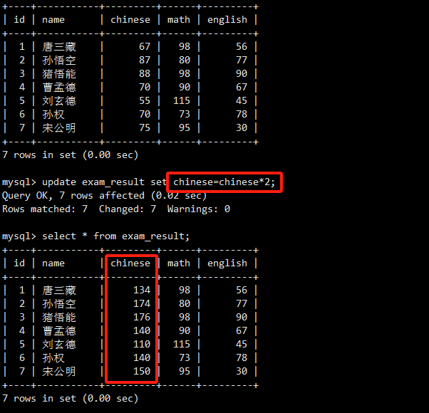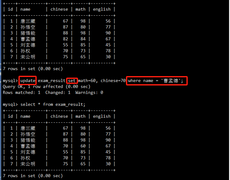 这里尝试更新id=100的记录,但name的新值'曹阿瞒'与旧值相同,所以返回0 rows affected。