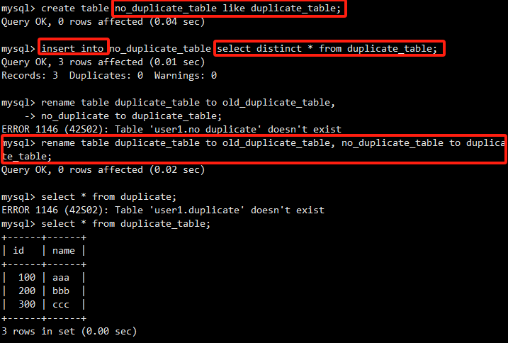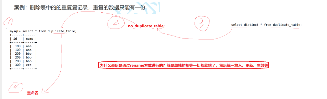 INSERT INTO no_duplicate_table SELECT DISTINCT * FROM duplicate_table;:将原表的去重后数据插入到新表中。RENAME TABLE duplicate_table TO old_table, no_duplicate_table TO duplicate_table;:通过原子性的RENAME操作,用新表替换旧表。这是一个非常高效且安全的操作,因为它避免了长时间锁定原表。*