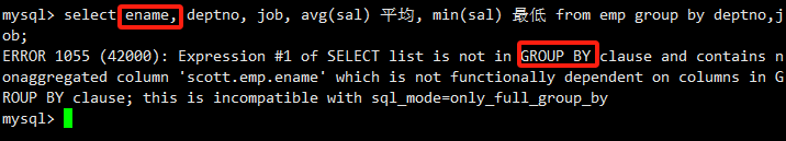 尝试在SELECT列表中包含ename(非聚合列,且不在GROUP BY子句中),导致报错。因为对于一个部门分组(如10号部门),存在多个ename(CLARK, KING, MILLER),MySQL不知道该显示哪一个。规则是:SELECT列表中所有非聚合函数包裹的列,都必须出现在GROUP BY子句中。