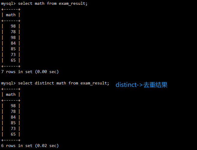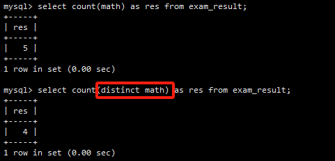 COUNT(DISTINCT math)计算了不重复的数学成绩的数量。