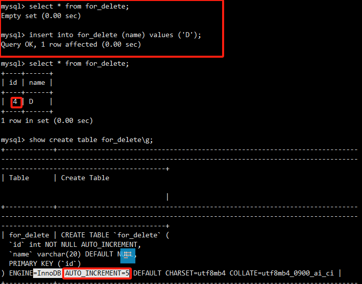 执行DELETE后,表变空。但再次插入数据时,自增id从4开始,延续了删除前的值。show create table也显示AUTO_INCREMENT=4。