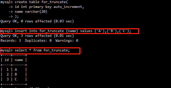 执行TRUNCATE后,表变空。再次插入数据,自增id从1重新开始。show create table显示AUTO_INCREMENT=2(下一个值)。
