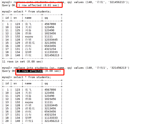 使用REPLACE INTO插入id=100的记录。由于冲突,MySQL删除了原有的id=100的行,并插入了新行。查询结果中,id=100的记录被替换。返回2 rows affected也印证了这个"先删后插"的过程。