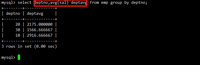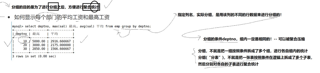 GROUP BY deptno将所有员工按部门编号分组。然后,AVG(sal)和MAX(sal)分别计算每个分组(即每个部门)的平均工资和最高工资。